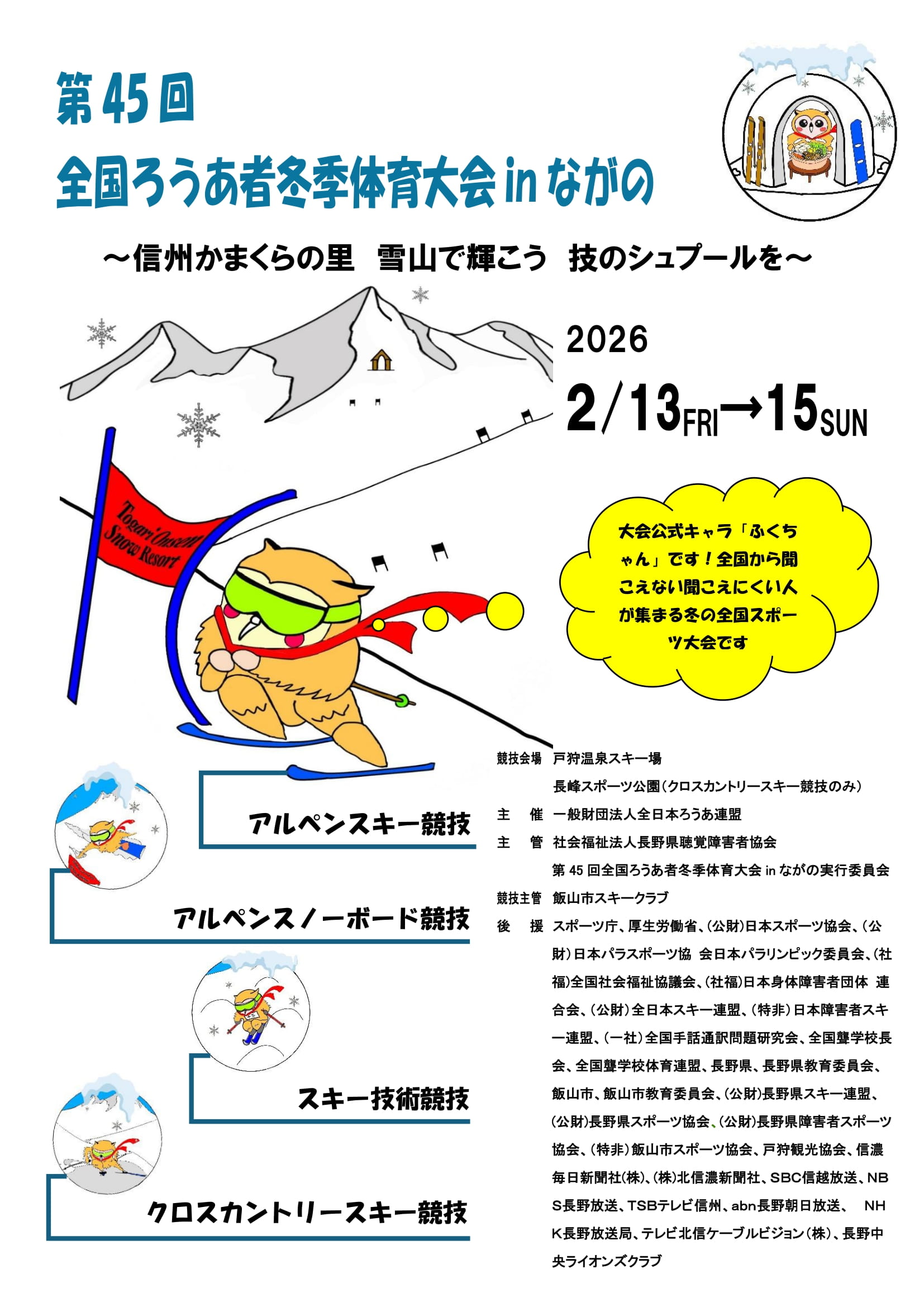 全国ろうあ者冬季体育大会 2026年2月13日(金)~15日(日)長野県飯山市で開催 2025年3月21日 最終更新日時 : 2025年3月21日 miyazaki-deaf02 詳しくは、長野県聴覚障害者協会のHPをご覧ください。 第45回全国ろうあ者冬季体育大会㏌ながの - 社会福祉法人長野県聴覚障害者協会 社会福祉法人長野県聴覚障害者協会 FacebookXBlueskyCopy