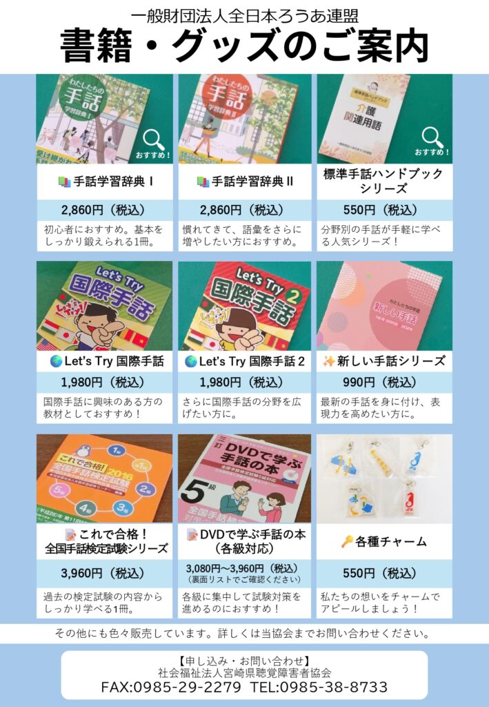 こちらでは、全日本ろうあ連盟からの販売書籍を紹介しています。申込書をダウンロードの上、担当窓口までFAXいただければ、希望日にお渡しできます。ご自宅への郵送も可能ですが、その場合は郵送料は自己負担となります。